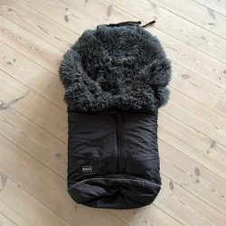 Grå åkpåse med dragkedja framtill. Åkpåsen har öppningar för barnvagnens sele.