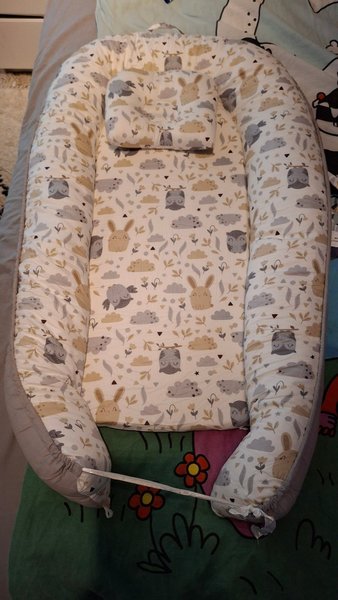 Ett mysigt babynest med ett fint mönster. Perfekt för din baby att sova eller vila i. Finns katt och hund i hemmet.