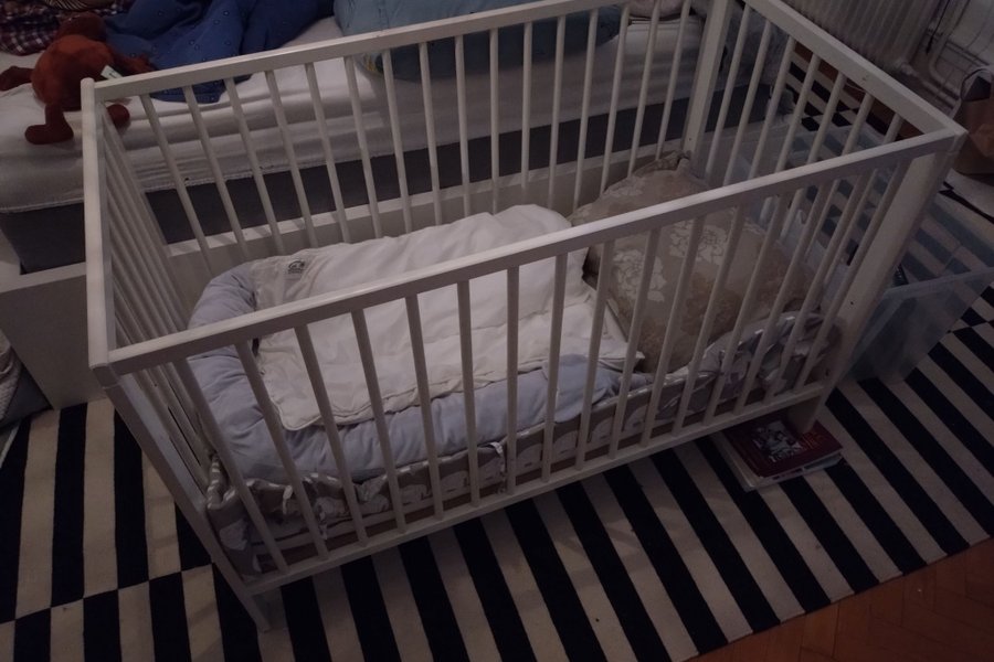 Spjälsäng i vitt trä. Några märken i färgen men inga funktionsfel. Sängkläder medföljer ej. Madrassen (använd) kan medfölja.