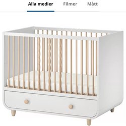 Grå spjälsäng med ribbotten och madrass med blått överdrag. Spjälsängen har några skavanker.