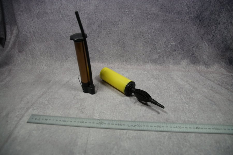 Två luftpumpar, en i guld/svart och en i gul/svart. Perfekta för att pumpa upp ballonger eller andra mindre uppblåsbara föremål.