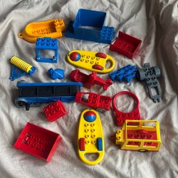 Ett sortiment av Lego Duplo-delar i olika färger och former. Perfekt för att bygga och skapa!