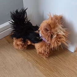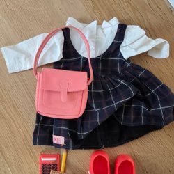 En fin docka med rött hår och glasögon. Hon har en rutig blus, en brun kjol med spetsdetaljer, rosa strumpor och bruna skor. Perfekt för lek och samling!
