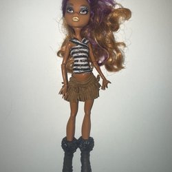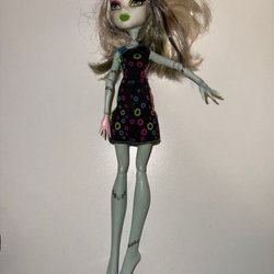 Skelita Calaveras docka från Monster High. Hon har svart hår med blåa slingor och bär en rosa topp och en svart kjol med dödskallemönster. Hon har även ett par orangefärgade skor. Saknas ställ till denna.