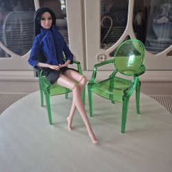 Bratz docka med kläder och skor. Dockan har brunt hår med rosa slingor och bruna ögon. Hon har en lila topp med strass från Tess-Creations och bruna byxor med mönster.