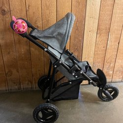 Dockvagn med mönstrat tyg i blått, rött och vitt. Vagnen har en sufflett och ett säkerhetsbälte. Den är hopfällbar för enkel förvaring.