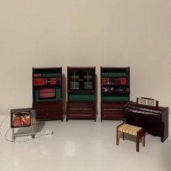 Ett set med Lundby dockskåpsmöbler. Innehåller soffa, fåtöljer, säng, spjälsäng, skåp, eldstad, bord.