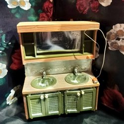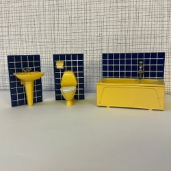 Lundby badrumsmöbler med handfat, dusch och toalett.