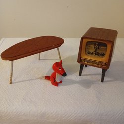 Liten dockskåps radio . Mått ca.4x5. liten bit av på underredet.