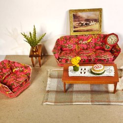 Dockskåpsmöbler i Lundby-skala. Soffa och fåtölj av trä och vinyl. Soffbord av trä. Blomlåda, katt och Coca Cola-flaska av plast. Duk och matta av textil. Bok av papper. Sofforna är 9.5 och 13.5 cm breda, sitthöjd 2 cm, djup 4.5 cm. Bordet är 5x9.5 cm och 3 cm högt. Blombordet är märkt Lundby. Några pyttesmå märken som knappt syns på sofforna (se bilder). I övrigt är alla delar hela och i mycket fint skick.