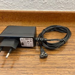 Lundby transformator för dockskåp. Transformatorn är svart med en vit sladd och en vit kontakt.