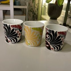 4st små kaffekoppar/muggar/lattekoppar för lek. Ca 5,5 cm höjd. Porslin.
