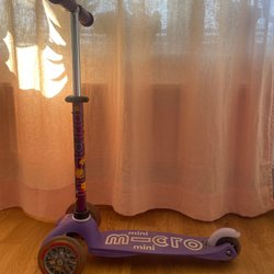 En rosa med orange Micro sparkcykel för barn. Perfekt för lek och utomhusaktiviteter.