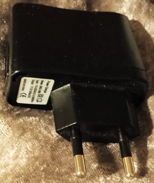 Strömadapter med följande specifikationer: Ingång: 100-250V, 50/60Hz, 0.15A. Utgång: 5.0V, 1000mA. Tillverkad i Kina.