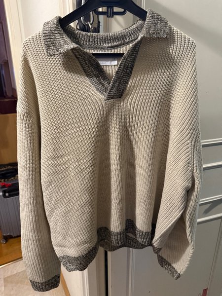 Beige stickad tröja med en grå krage och nederkant. Tröjan har en avslappnad passform och långa ärmar.