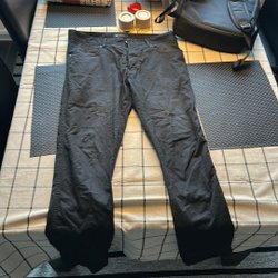 Svarta byxor med dragkedja och knappstängning. Byxorna har fickor fram och bak.