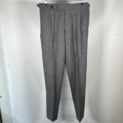 Byxor med raka ben och medelhög midja. Försluts med dragkedja och hake framtill. Byxorna har en klassisk och tidlös design som passar för många tillfällen. Lappen och knappen som man stänger byxorna med har ramlat av men de går fortfarande att knäppa byxorna. Lite noppriga