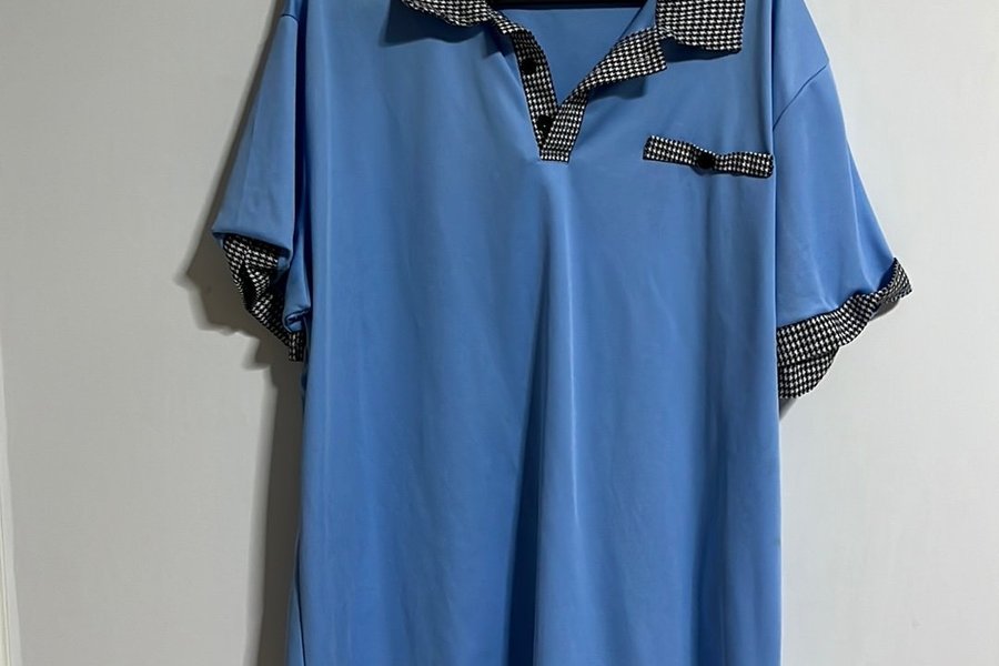Blå kortärmad skjorta med krage och detaljer i ett svartvitt hundtandsmönster. Skjortan har en liten bröstficka med en dekorativ detalj i samma mönster som kragen.