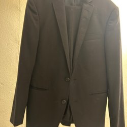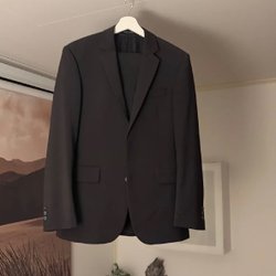 Klassisk mörkblå kostym från Tiger of Sweden. Kavajen har en enkelknäppning och passpoalfickor. Byxorna har pressveck och en smal passform. Både kavaj och Byxa är i storlek 46.