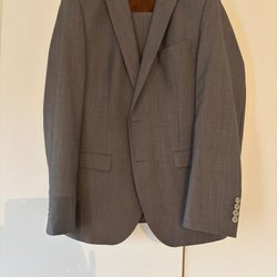 Grå kostym med kavaj och byxor. Kavajen har två knappar och fickor fram. Byxorna matchar kavajen i färg och stil. Det är storlek 50 på kavajen och 52 på byxorna