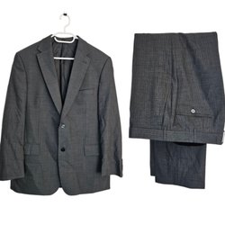 Grå kostym med kavaj och byxor. Kavajen har en klassisk passform med två knappar fram. Byxorna har en avslappnad silhuett med pressveck.