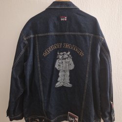 Jeansjacka med tryck av Fantastic Four på ryggen. Jackan har flera fickor framtill och knäppning med knappar. Det finns även en liten röd etikett med texten "MARVEL" nedtill på framsidan.