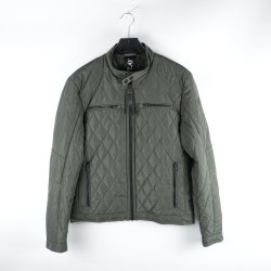 Olivgrön jacka med dragkedja och diamantmönster. Jackan har fickor med dragkedja framtill och en liten detalj på höger ärm. Observera att det finns ett litet hål på vänster ärm.