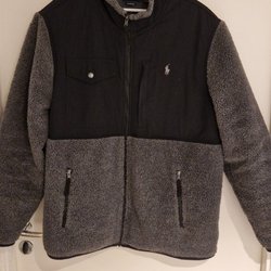 Gråmelerad fleecejacka med huva och dragkedja. Jackan har två fickor fram med dragkedja. Denna är lite längre och påminner något om en rock.