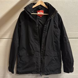 Svart bomberjacka med dragkedja framtill. Jackan har en ribbad krage, muddar och nederkant. Det finns två sidfickor med dragkedja och en mindre ficka med dragkedja på vänster ärm.