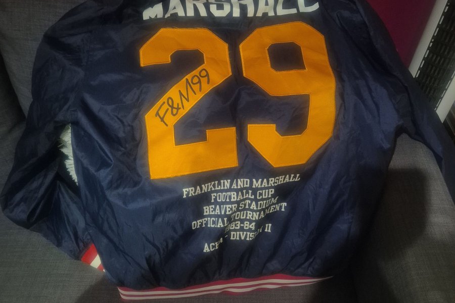 En mörkblå jacka med texten "MARSHALL" i vitt över axlarna. Stora gula siffror "29" är centrerade på ryggen, med texten "F&M99" i svart över den vänstra siffran. Nedanför siffrorna finns texten "FRANKLIN AND MARSHALL FOOTBALL CUP BEAVER STADIUM OFFICIAL TOURNAMENT 1983-84 ACHA - DIVISION II" i vitt. Jackan har röda och vita ränder på kragen och muddarna.