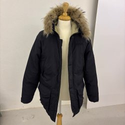 Klassisk jacka från Morris i en mörkgrön färg och en krage i fuskpäls. Jackan har flera fickor framtill och två innerfickor. Den stängs med både dragkedja och knappar. En knapp saknas (se bild). Är ett sk ’sale sample’ 2008.