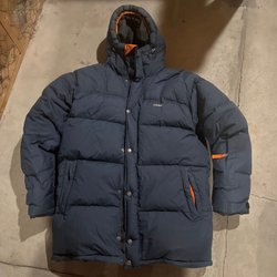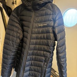 Svart vadderad jacka med huva. Jackan har dragkedja fram och muddar vid ärmslut.