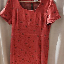 Vacker hemsydd klänning i tunn polyester utan stretch. Ganska genomskinlig. Markerad under byst. Knäppning fram. Bra skick.