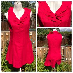 Fin rostbrun klänning med dekorativa knappar fram. Dragkedja i ryggen. Axelvaddar. Polyesterbomullsblandning. Fodrad. Bra skick.