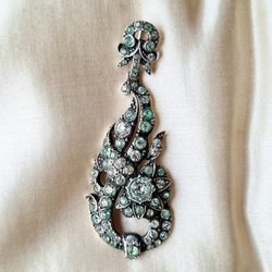 Elegant skimrande festklänning från 50/60-talet med en dekorativ ros i urringningen. Stängs med dragkedja i sidan.