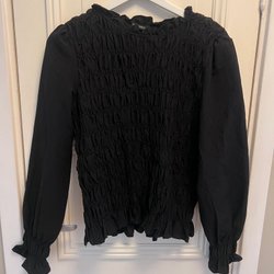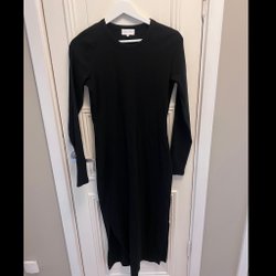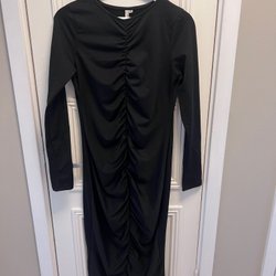 Svart klänning med lång ärm och volangdetaljer. Klänningen har en v-ringning och en avslappnad passform.