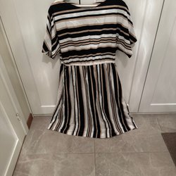 Klänningen har korta ärmar och en rund halsringning. Dold dragkedja på sidan