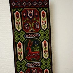 Klänning med ett blommigt livstycke och en kjol med ett stort blommönster i rosa, grönt och brunt. Klänningen har en omlottdesign vid bysten och ett band i midjan som kan knytas baktill. Överdelen är finstickad