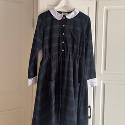 Det finns tecken på användning, och jag har märkt att tyget är något slitet vid knytbandet i midjan. I övrigt ser jag inga fläckar eller större skador, men klänningen säljs ändå i befintligt skick.