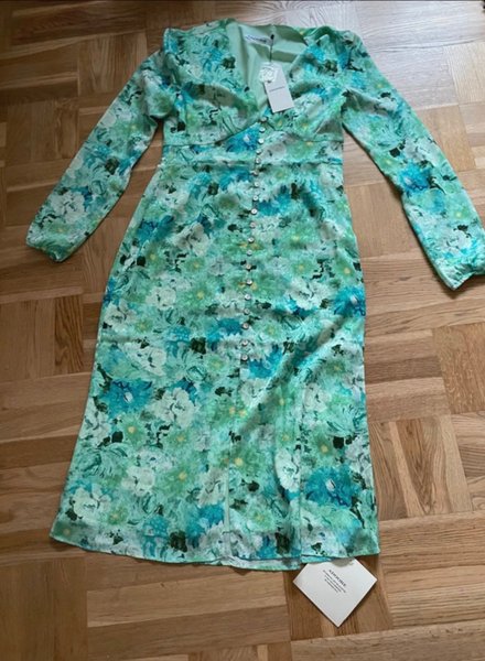 Långärmad klänning med knappar framtill och V-ringning. Klänningen har ett blommigt mönster i olika nyanser av grönt och blått.