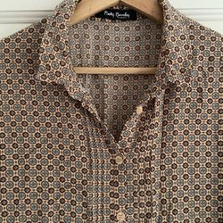 Långklänning med knappar framtill och knytband i midjan. Klänningen har långa ärmar med manschetter och en rundad krage. Storlek M.