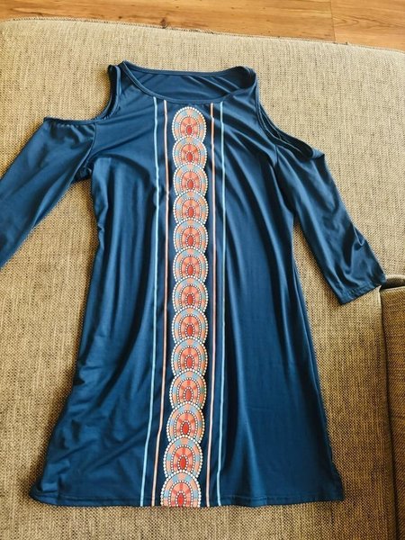 Blå klänning med lång ärm och detaljer i form av cirklar i orange och ljusblått. Klänningen har cut-out detaljer vid axlarna. Storlek:40-42.