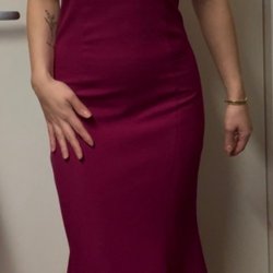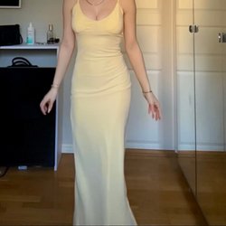 En figurnära ribbad klänning i midi-längd med smala axelband. Klänningen har en rak halsringning och är designad för att framhäva figuren.