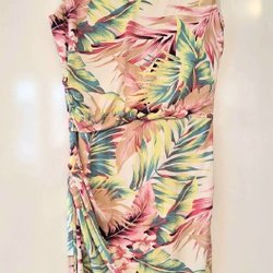 Klänning med V-ringning och korta ärmar. Klänningen har ett brett bälte i midjan med ett spänne. Mönstret består av diagonala ränder i olika bredder och färger.