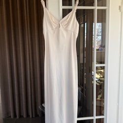 Vit klänning med tunna axelband och draperad urringning. Klänningen har en markerad midja med rynkningar och en kjoldel som faller i lager.