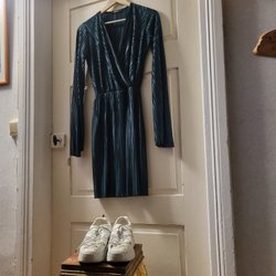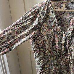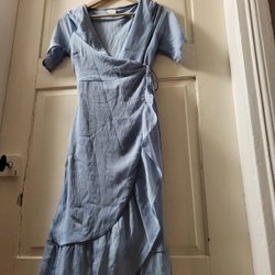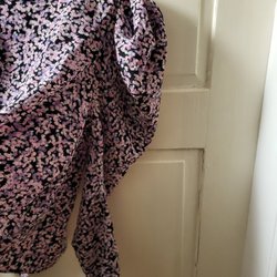 Leopardmönstrad klänning med lång ärm och omlottdesign. Klänningen har en asymmetrisk fåll och knytdetalj i midjan.