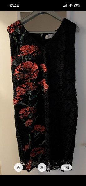En svart spetsklänning med röda blommor, underklänning, ärmlös, knälång. Knappt använd .