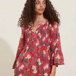 Luftig sommarklänning med kort ärm och spetskantad V-ringning. Veckdetaljer framtill och somrigt mönster i olika nyanser av grönt och grått.