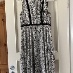Svart och vit mönstrad klänning med lång ärm och drapering i sidan.