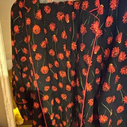 Klänning med ett intrikat mönster i olika nyanser av blått och grått. Klänningen har en V-ringning med en ljusare kant som löper runt halsen och ärmsluten. Mönstret består av vågiga, sicksackliknande former som ger ett dynamiskt intryck. Ärmarna är korta och vida, vilket bidrar till en avslappnad passform.